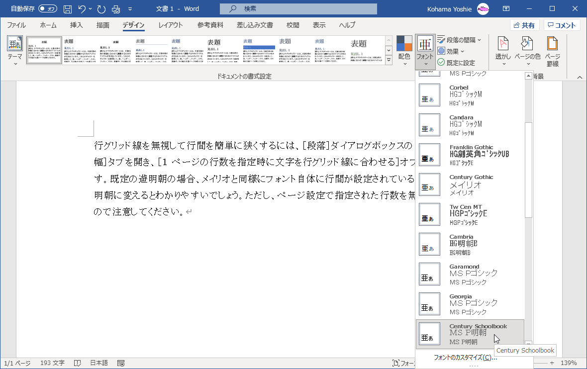 - あらかじめ、MS明朝体のフォントにしておきます。ここでは、[デザイン]タブの[フォント]一覧より選択します。