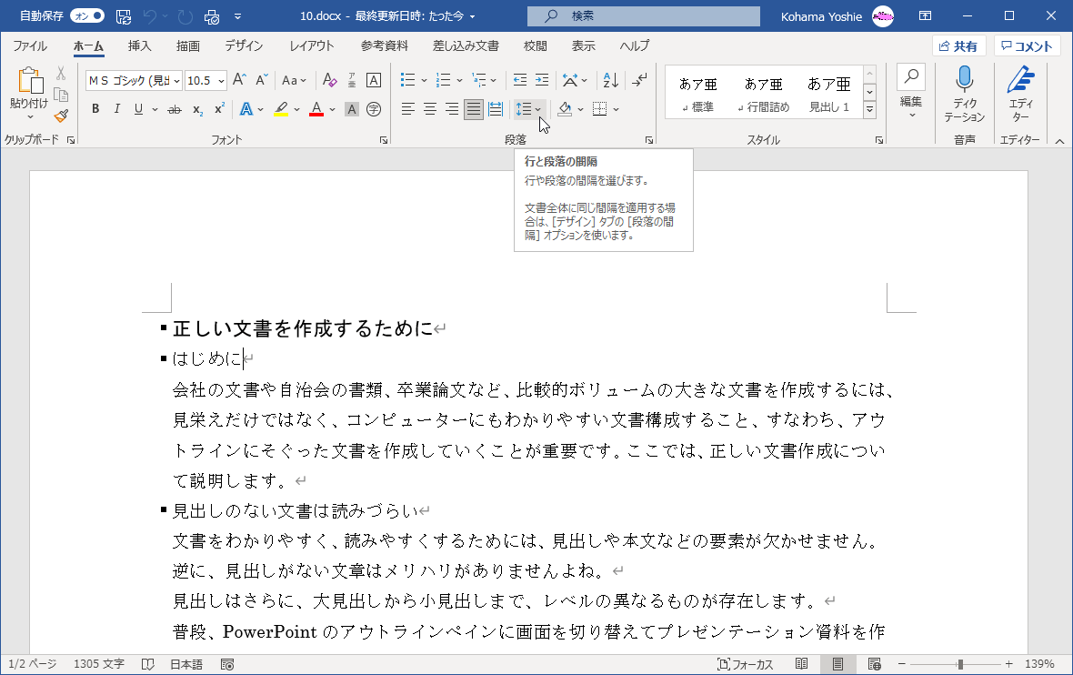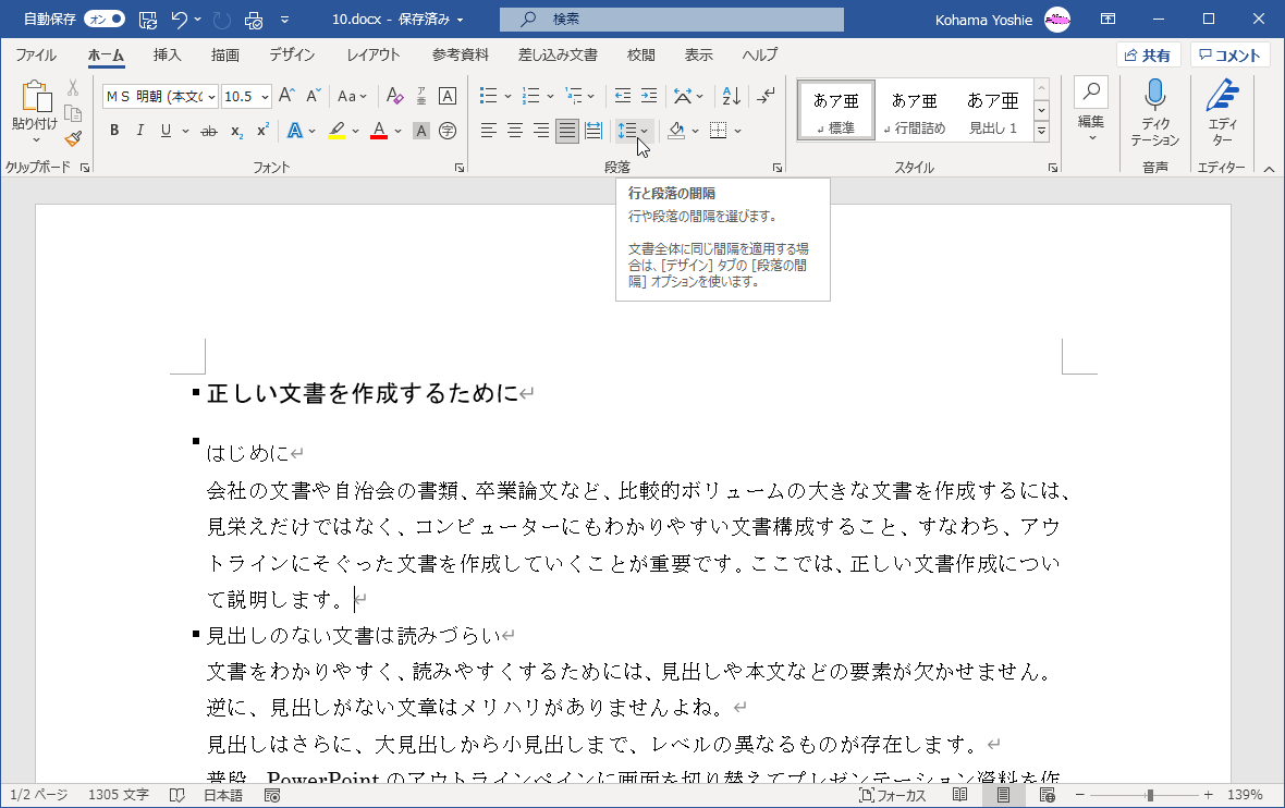 段落の前または後ろに素早く間隔を追加するには、[ホーム]タブの[段落]グループにある