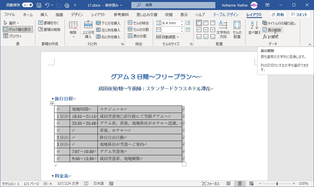 - 右側のテーブルの[レイアウト]タブを開き、[データ]グループの[表の解除]をクリックします。