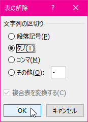 [表の解除]ダイアログボックスで解除方法を選択します。ここではタブ区切りでOKなのでそのまま[OK]ボタンをクリックします。