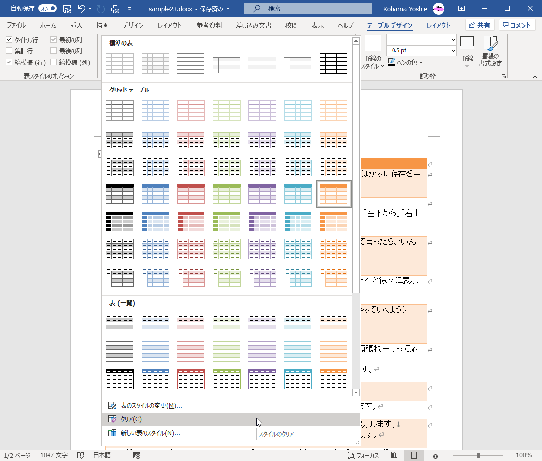 - 表のスタイルがクリアされました。