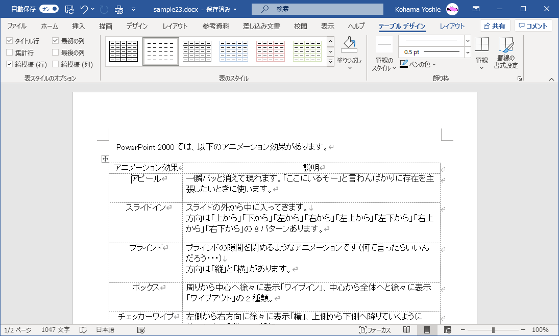 - 表内にカーソルを移動して[テーブル デザイン]タブをクリックします。