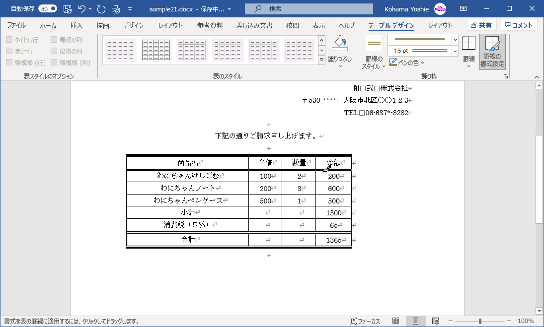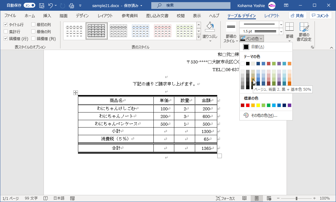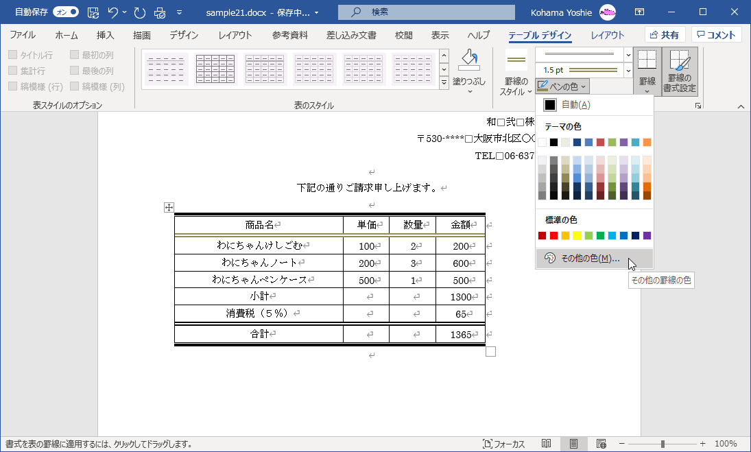 罫線のスタイル一覧にない色にするには、表内にカーソルを移動して[テーブル デザイン]タブ内の[ペンの色]一覧より選択し、表の罫線にクリックしてドラッグして適用します。