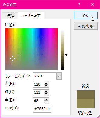 フルカラーより選択するには、[色の設定]ダイアログボックスの[ユーザー設定]タブより指定したい色を指定して[OK]ボタンをクリックします。16進数カラーコードを入力してもOKです。