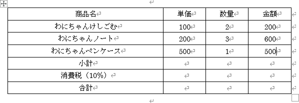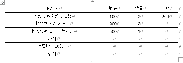 | 商品名 | 単価 | 数量 | 金額 |