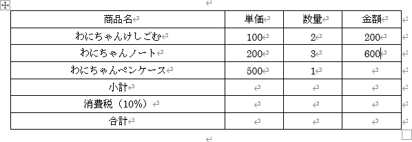 - 「わにちゃんペンケース」の金額の計算式は「=B4*C4」となります。