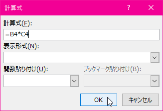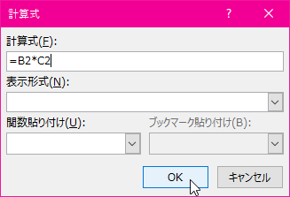 - [計算式]ダイアログボックスが表示されたら、[計算式]ボックスにあらかじめ代入されているSUM(LEFT) を消して、その代わりに「B2*C2」と入力します。「SUM(LEFT)」を選択した状態で