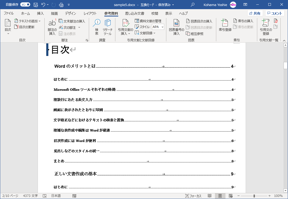 サンプルファイルには、すでに組み込みの目次が挿入されています。自分でやってみたい場合は、まず目次を削除してからトライしてみてください。