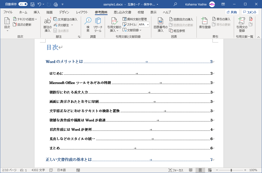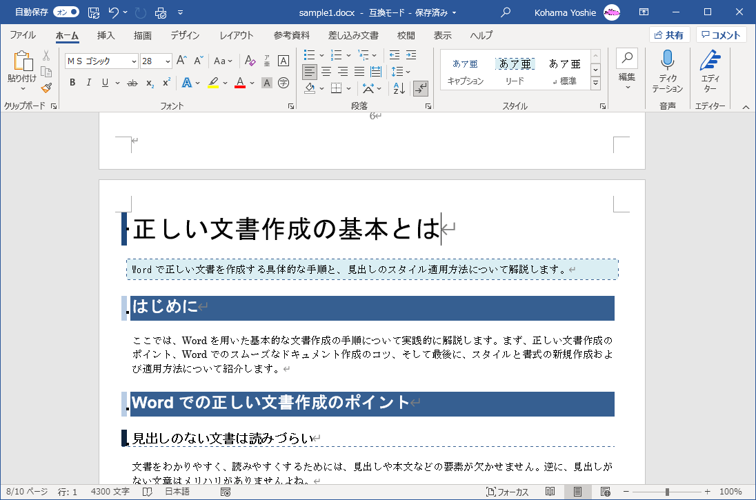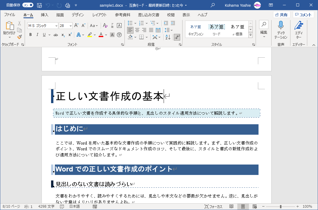 - サンプルファイルを開いて、「正しい文書作成の基本」から「正しい文書作成の基本とは」に変更します。
