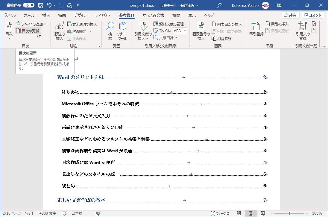 - [目次]グループの[目次の更新]をクリックします。