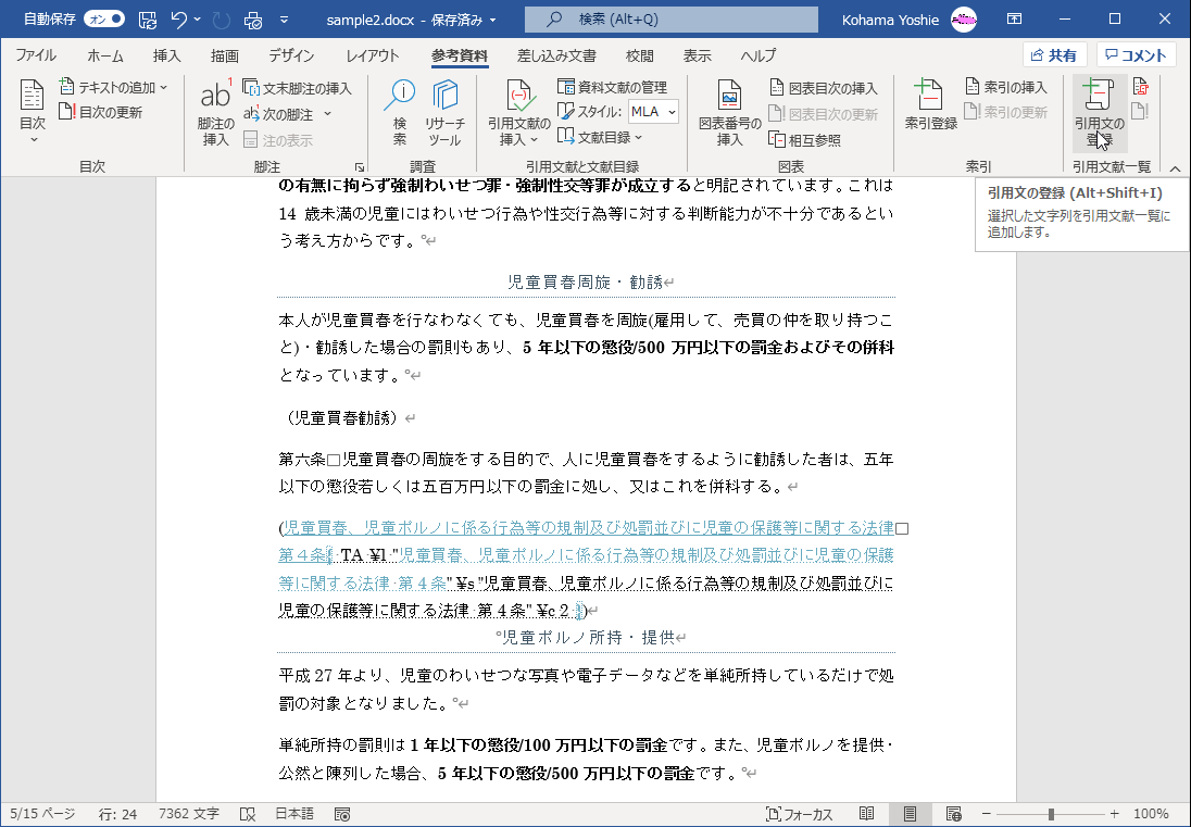 - [参考資料]タブの[引用文献一覧]グループの[引用文の登録]をクリックします。