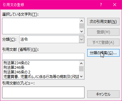 - [引用文献の登録]ダイアログボックスの[分類の編集]ボタンをクリックします。