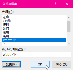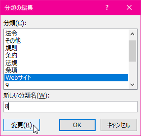 - [分類]ボックスから8~16の数字から空いている数字を選択し、新しい分類名を入力して[変更]ボタンをクリックします。