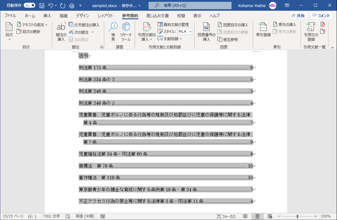 [編集記号の表示/非表示]をクリックします。 - [参考資料]タブの[引用文献一覧]グループの[引用文献一覧の更新]をクリックします。