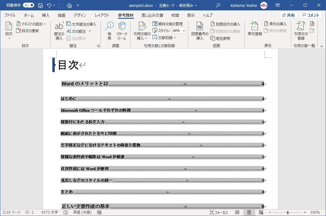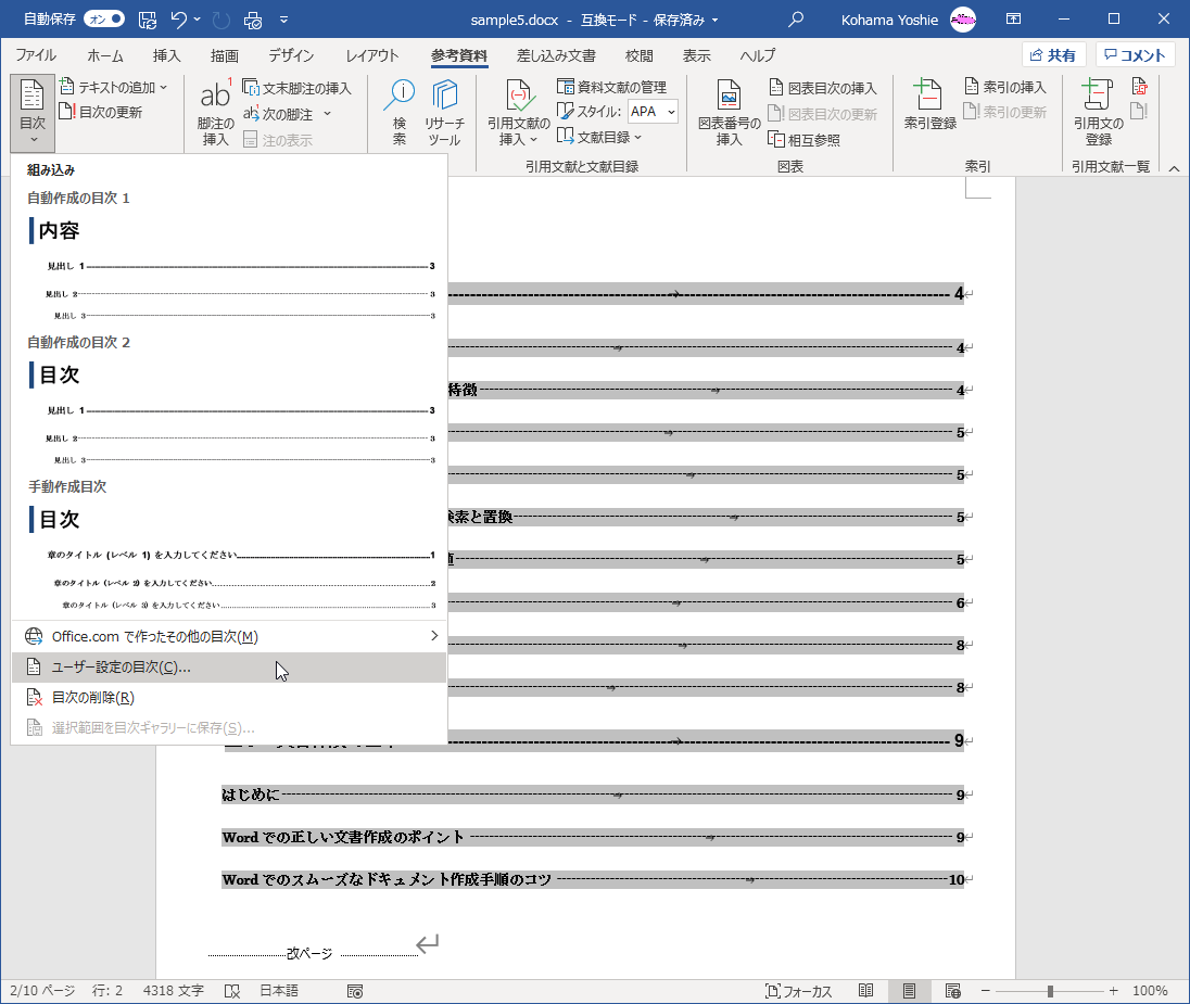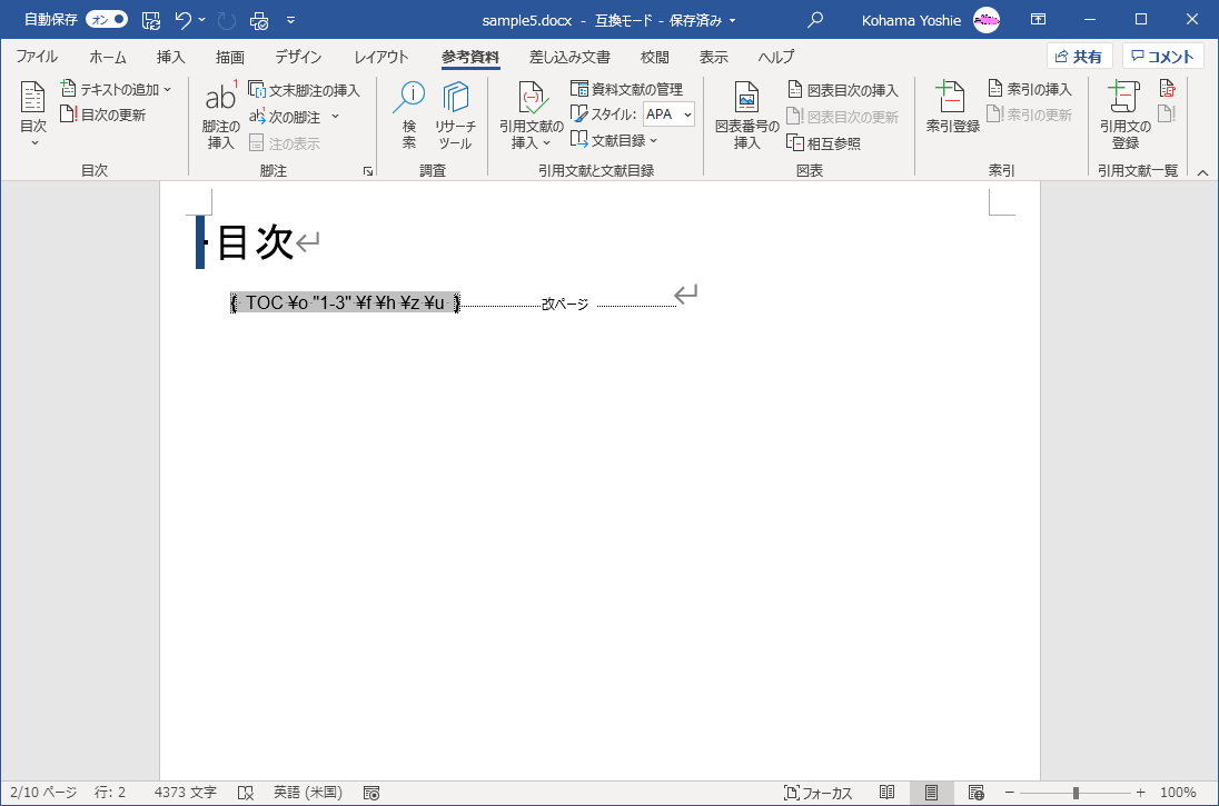 - [参考資料]タブを開き、[目次]グループの[目次]をクリックします。