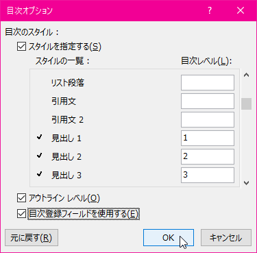 ユーザー設定の目次において、個々のスタイルの目次のレベルを指定したり、目次登録フィールドを使用したりするには、[目次]ダイアログボックスの[オプション]ボタンをクリックします。