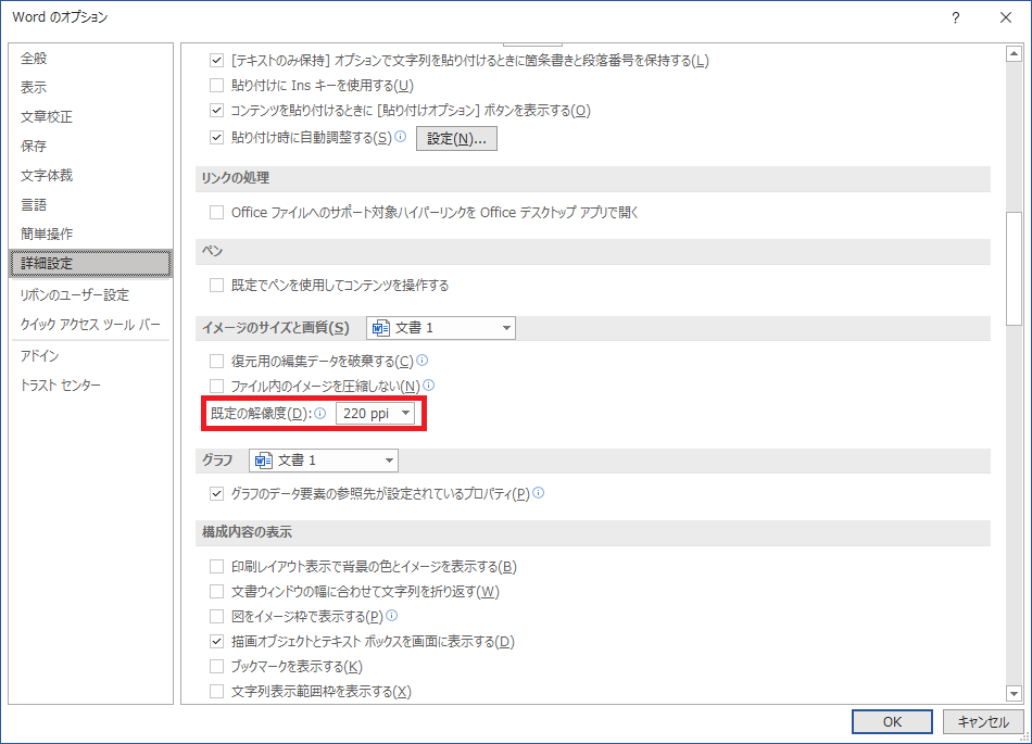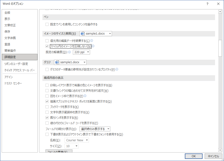 もし、オリジナルの画像の品質を保持する場合、そのマスター画像を安全な場所に保管するか、[Wordのオプション]の[詳細設定]の[イメージのサイズと画質]オプションにて、[ファイル内のイメージを圧縮しない]にチェックをつけます。[ファイル内のイメージを圧縮しない]にチェックを付けておくと最高の画質になりますが、ファイルのサイズが非常に大きくなる可能性があります。オリジナル画像を別保管が現実的でしょう。
