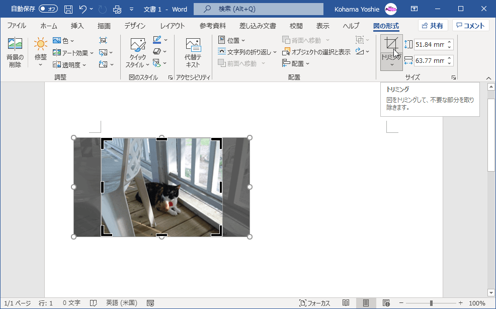 元の縦横比を維持して図のサイズを変更し、図の領域全体に表示するようにするには、対象となる画像を選択して[図の形式]タブを開き、[トリミング]の▼をクリックして[塗りつぶし]を選択します。なお、図の領域からはみ出る部分はトリミングされます。
