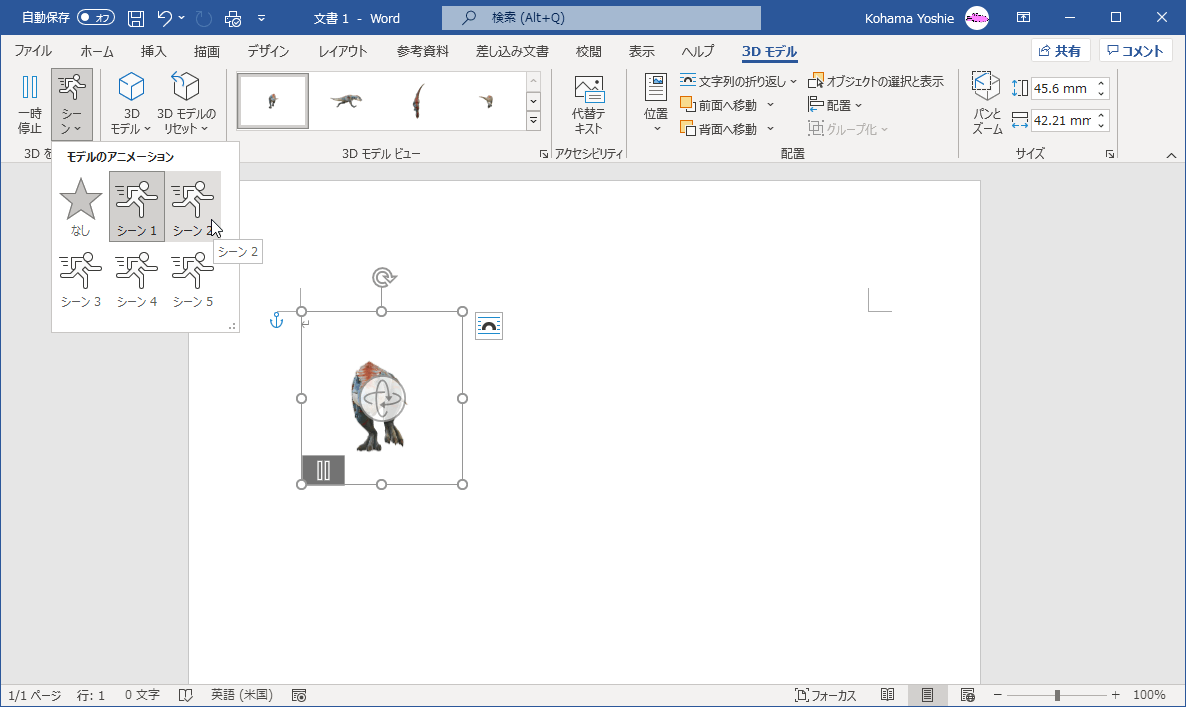 3Dモデルで使用できるシーンを検索し、再生に使用するシーンを選択するには、対象となる3Dモデルを選択し、[3Dモデル]タブの[3Dを再生]グループの[シーン]一覧より選択します。[なし]にすると、シーンが削除されて静止バージョンになります。