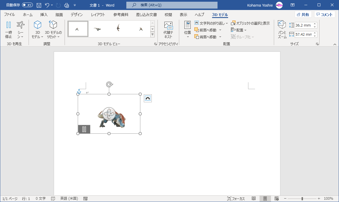 - 対象となる3Dモデルを選択し、[3Dモデル]タブの[3Dを再生]グループの[シーン]をクリックします。