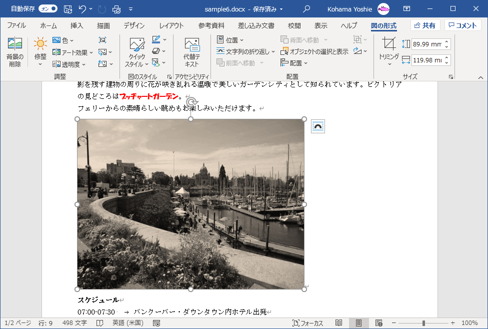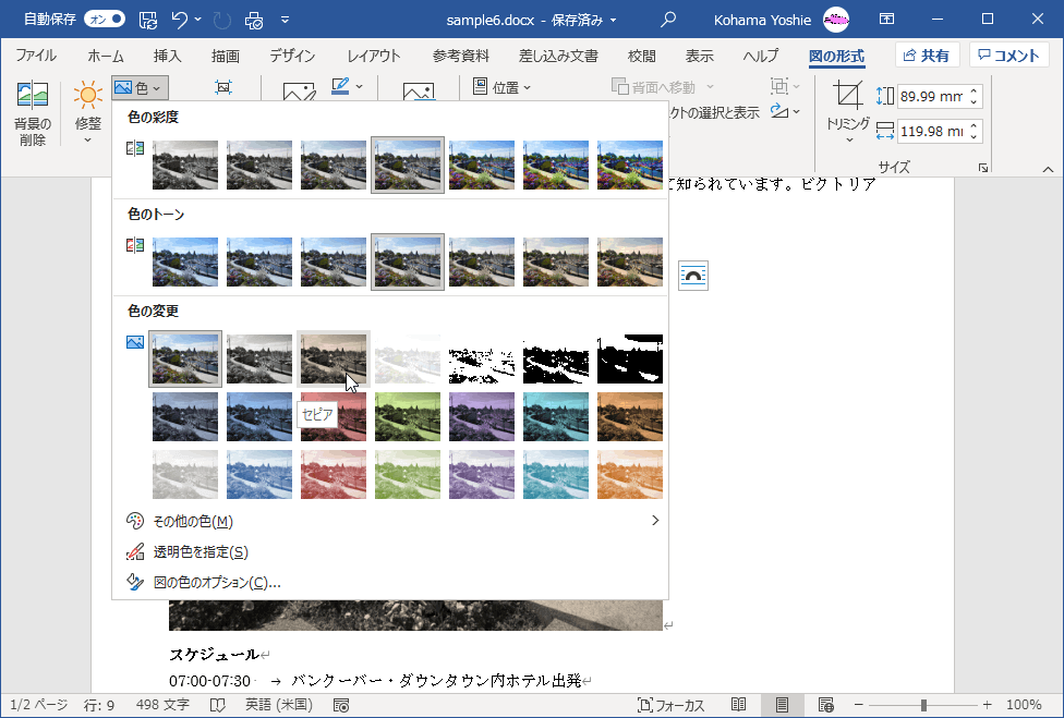 品質向上のために、またはドキュメントの内容に合わせて、図の色を変更するには、[図の形式]タブ内の[色]をクリックして、一覧から選択します。色を微調整するには、[図の色のオプション]を選択して、[図の書式設定]作業ウィンドウより調整できます。