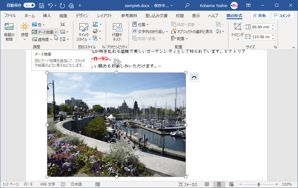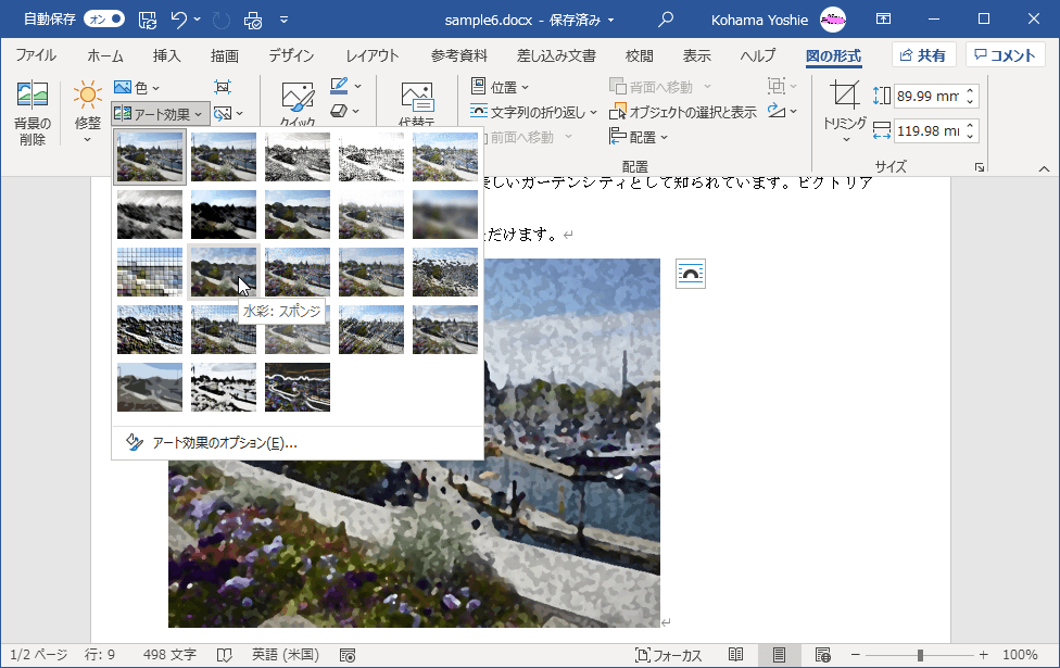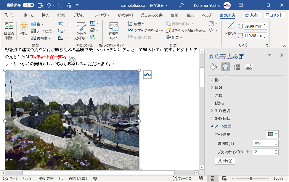 アート効果を細かく調整するには、[アート効果のオプション]を選択して、[図の書式設定]作業ウィンドウから調整できます。