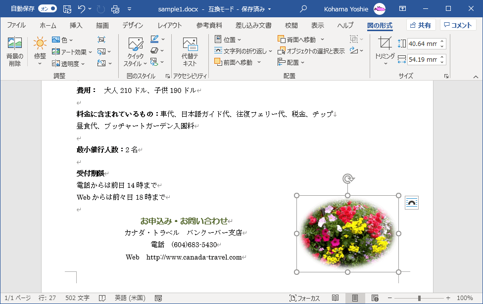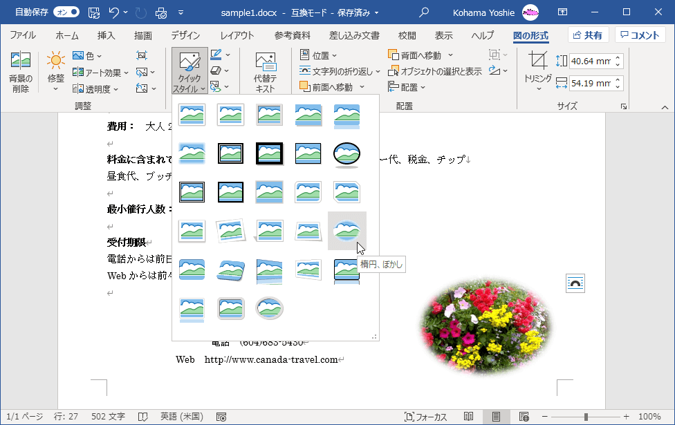 - 対象となる図を選択し、[図の形式]タブを開きます。