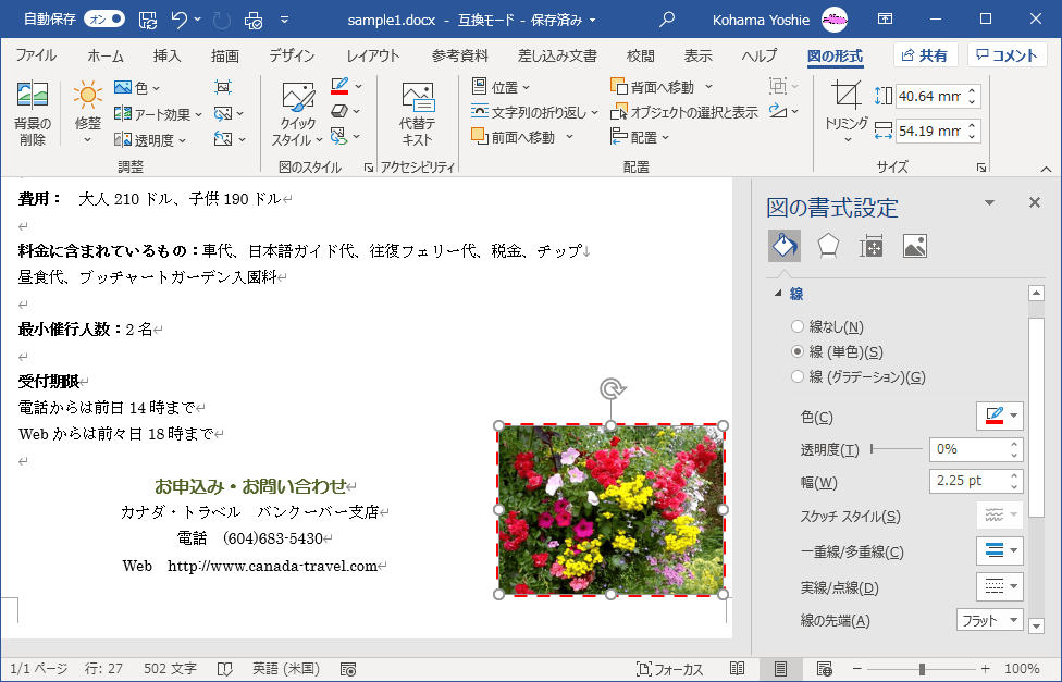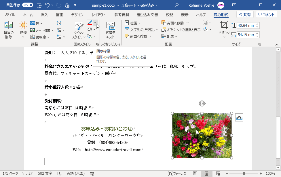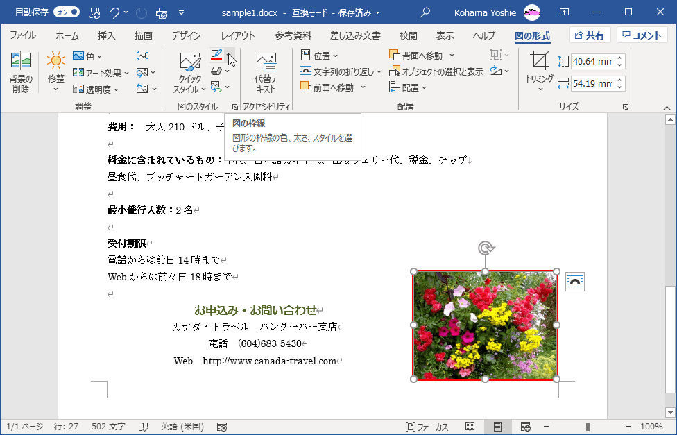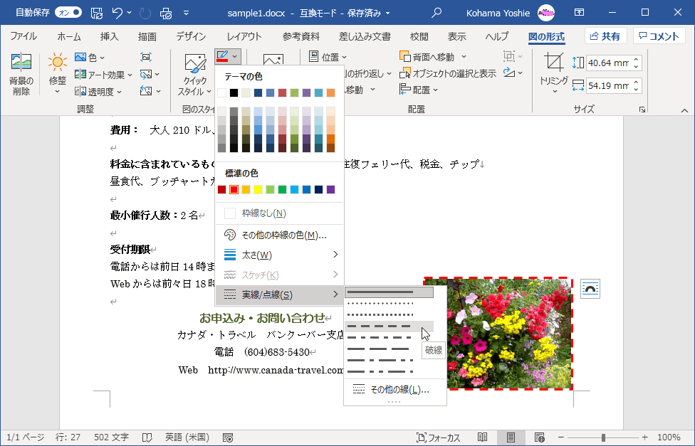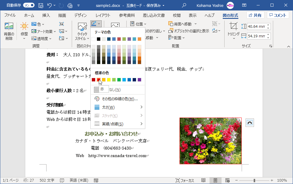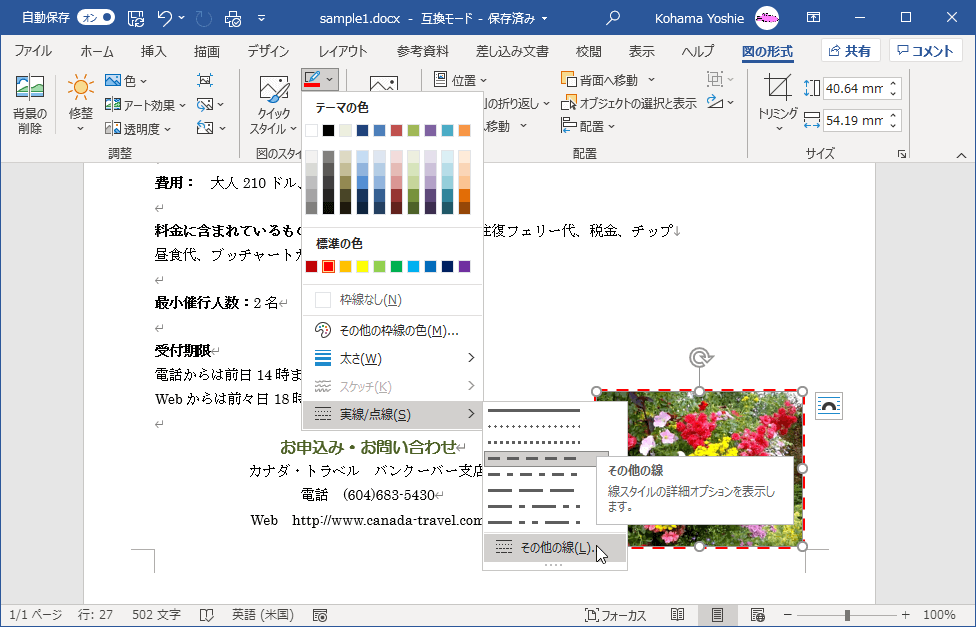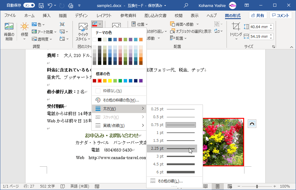 既定では0.75ptの太さの実線で枠線を付けることができます。[図の枠線]ボタンの左側をクリックすると、選択された色で枠線を引くことができます。他の色を指定するには、以下の手順に従います。
