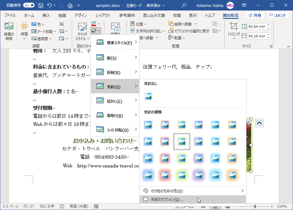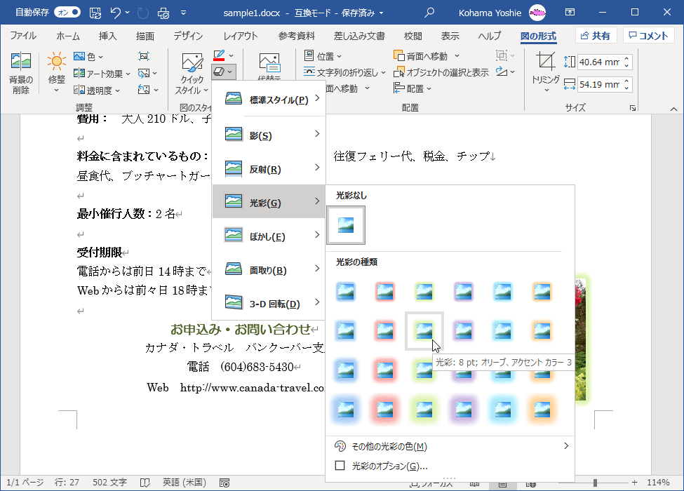 - サブメニューより目的の種類と効果を選択します。ここでは[光彩]をポイントして、光彩の種類から選択します。