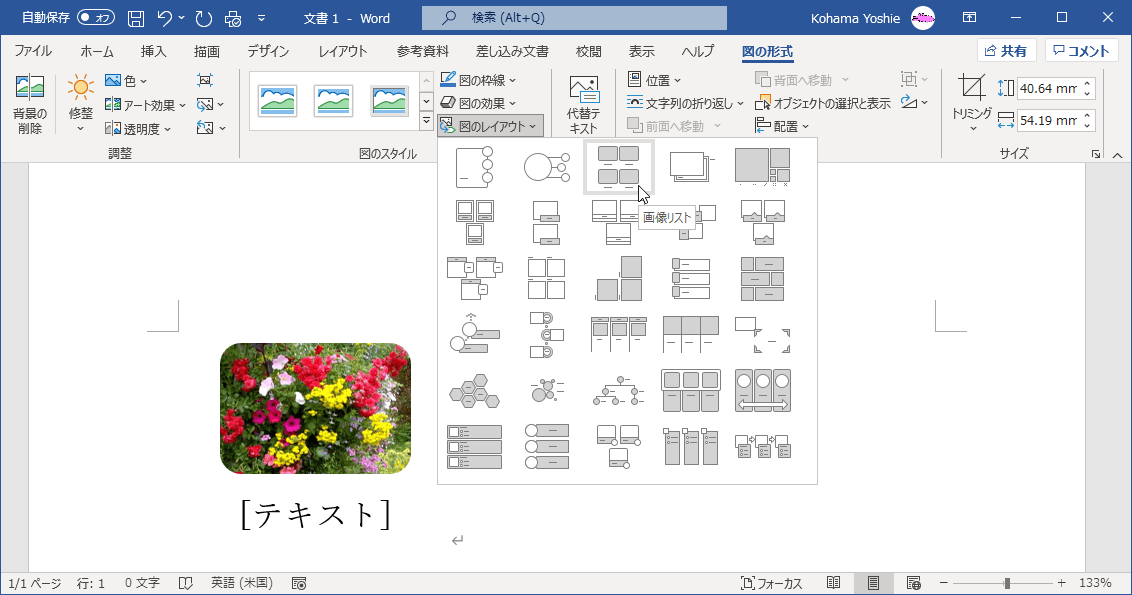 選んだ図をSmartArtグラフィックに変換して、整列、見出しの入力、サイズ変更を簡単に行えるようにするには、対象となる図を選択して[図の形式]タブを開き、[図のレイアウト]を選択して、SmartArtグラフィックの種類を選択します。この機能はWord 2016以降のWindows限定です。