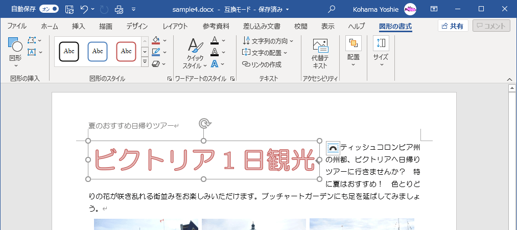 - [ここに文字を入力]と表示され、選択された状態となるので、このまま文字を入力します。ここでは「ビクトリア1日観光」と入力します。
