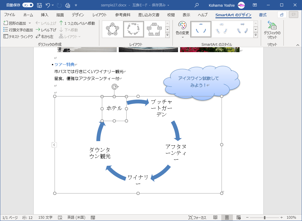 - [SmartArt のデザイン]タブを開き、[下へ移動]をクリックします。