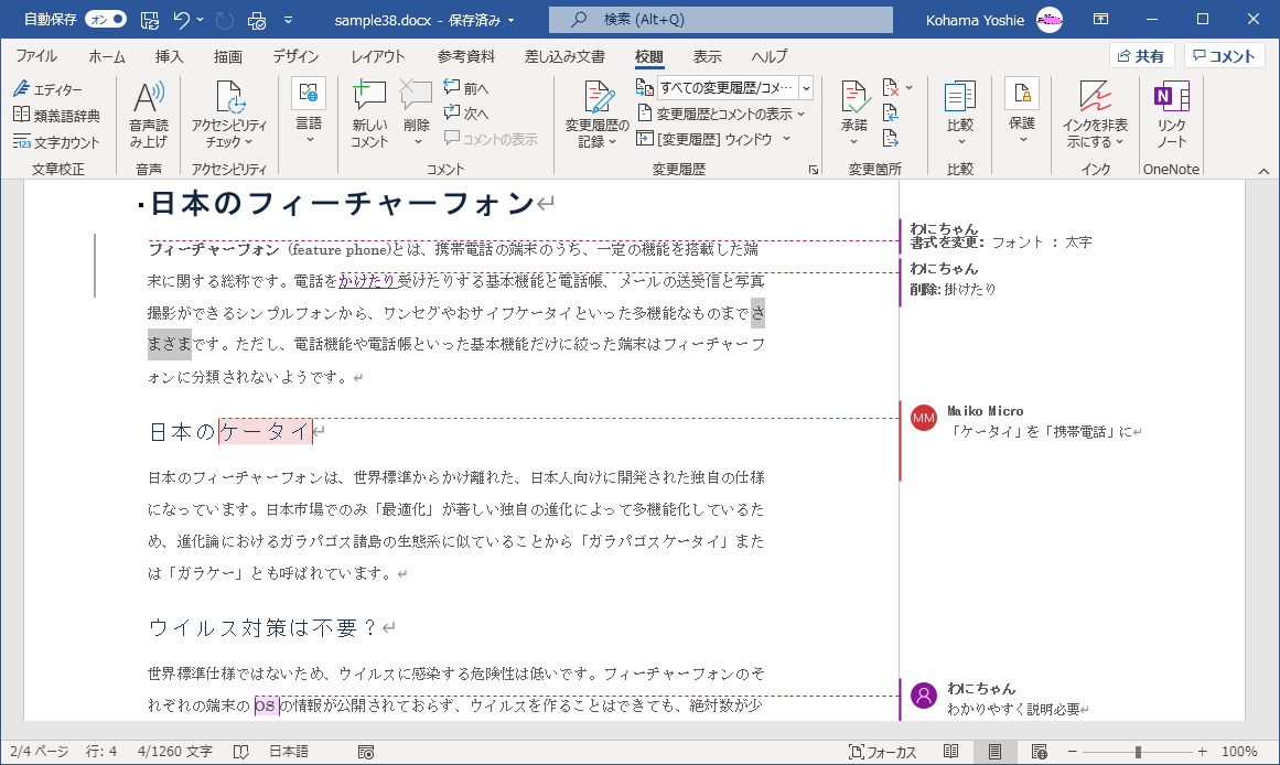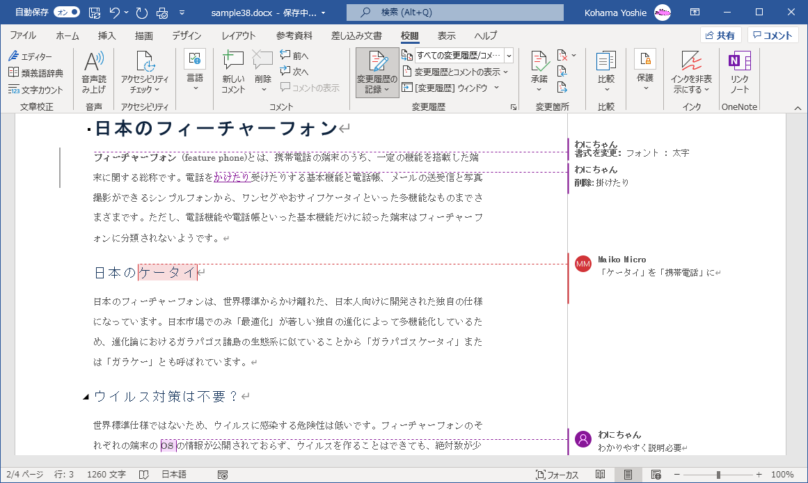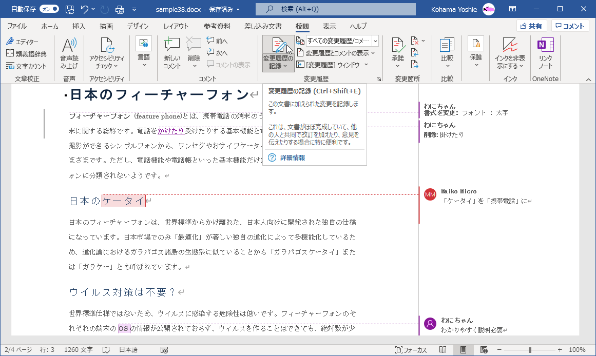 複数人による文書の共同作業において、校閲者により加えられた変更を記録するには、[校閲]タブの[変更履歴の記録]をクリックします。すると記録が開始され、もう一度そのボタンを押すとそのあとの操作の記録がされなくなります。変更履歴の記録のショートカットキーはCtrl+Shift+Eです。これは、文書がほぼ完成していて、他の人と共同で改訂を加えたり、意見を伝えたりする場合に特に便利です。