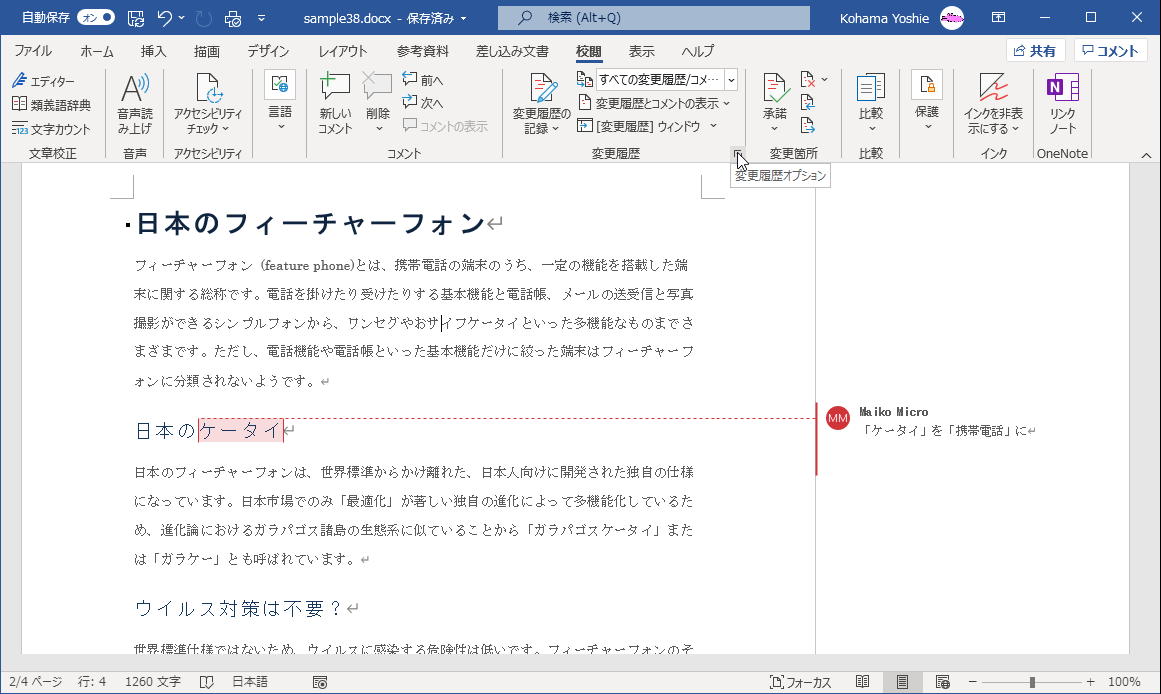 - [校閲]タブの[変更履歴]グループ右下の[変更履歴オプション]をクリックします。