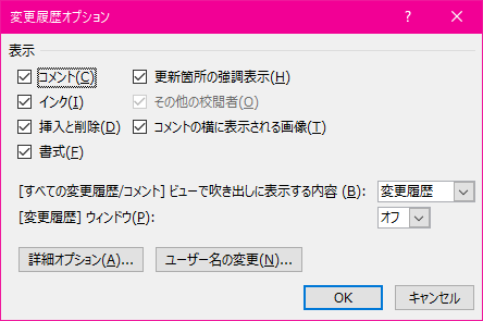 吹き出しに表示される内容、[変更履歴] ウィンドウの表示方法など、変更のカテゴリをオンまたはオフにするには、[校閲]タブの[変更履歴]グループ右下の[変更履歴オプション]をクリックして[変更履歴オプション]ダイアログボックスで行います。