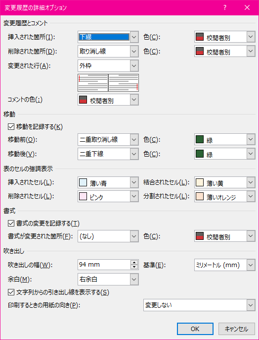- [変更の履歴の詳細オプション]ダイアログボックスの[変更履歴とコメント]、[移動]や[表のセルの強調表示]それぞれの書式を変更します。