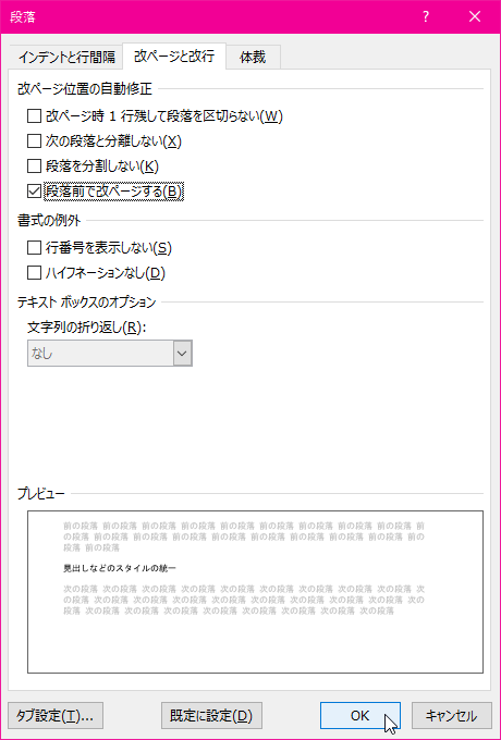- [段落]ダイアログボックスの[改ページと改行]タブを開き、[段落前で改ページする]のチェックを付けて[OK]ボタンをクリックします。