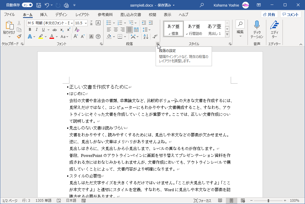 - [ホーム]タブの[段落]グループの[段落の設定]をクリックします。