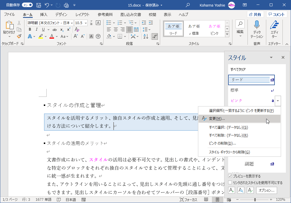 - [スタイル]ウィンドウの目的のスタイルの右側▼をクリックして[変更]を選択します。