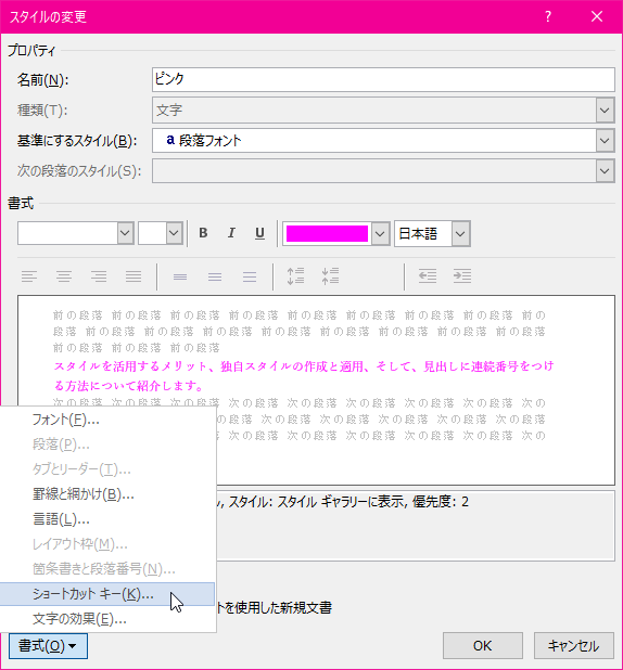 これから作成するスタイルの場合は[書式から新しいスタイルを作成]ダイアログボックス、既存のスタイルの場合は[スタイルの変更]ダイアログボックスの[書式]ボタンから[ショートカットキー]を選択し、ショートカットキーを指定します。
