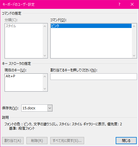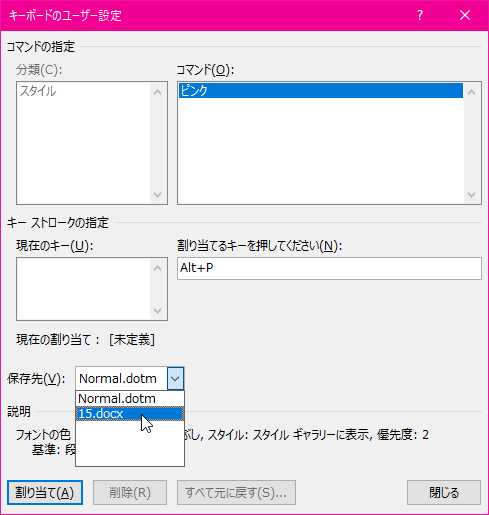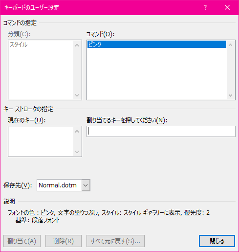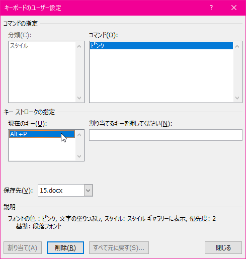 未定義のショートカットキーを指定します。キーボードでショートカットキーを押すと、[割り当てるキーを押してください]ボックスに自動的に代入されます。ここでは