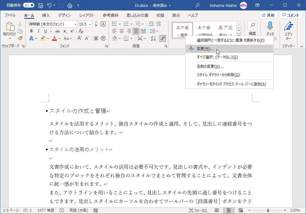 - [ホーム]タブの[スタイル]一覧の[標準]を右クリックして、ショートカットメニューより[変更]を選択します。