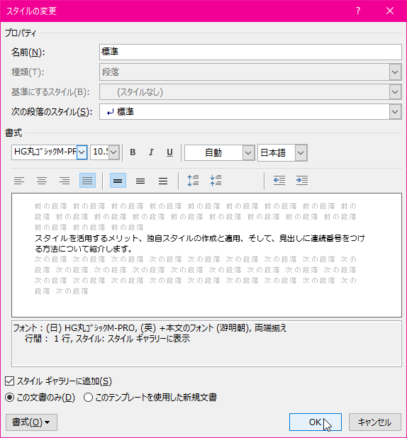 異なるテーマに変えたいフォントがある場合は、異なるテーマのフォントを適用する方法も有効ですが、テーマを変えずにフォントを自由に選びたい場合は「標準」のスタイルを変更すると良いでしょう。「標準」のスタイルを変更すると、すべての「標準」の段落のスタイルが変わります。