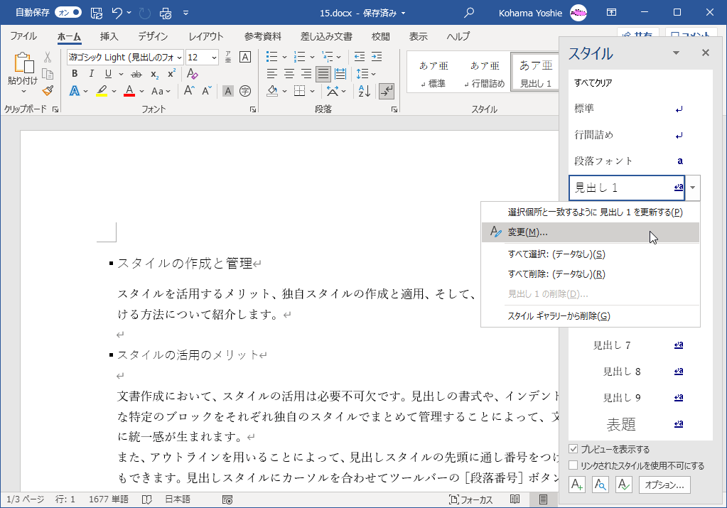 - 見出し1を右クリックしてショートカットメニューより[変更]を選択します。
