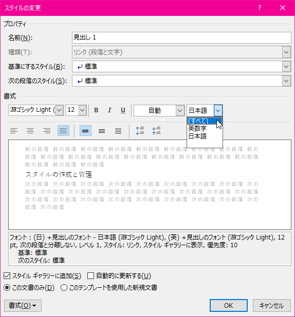[スタイルの変更]ダイアログボックスで、[日本語]から[すべて]を選択します。