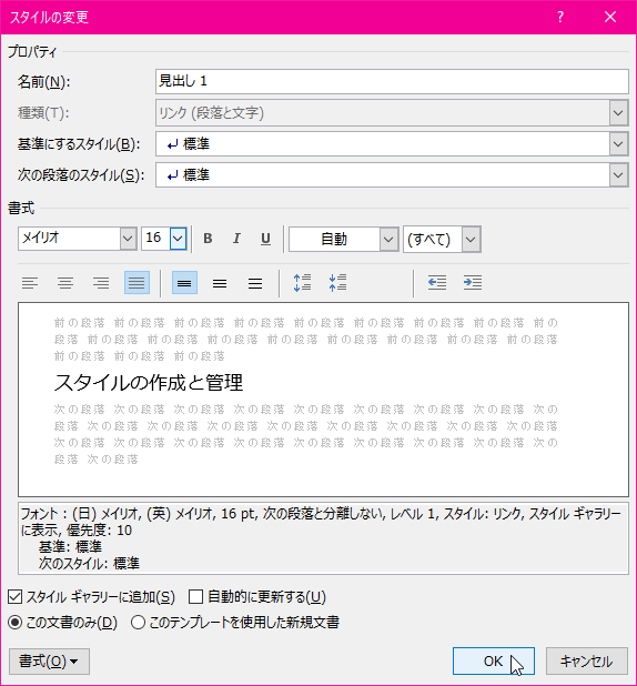 対象となる見出しレベルのスタイルを右クリックしてショートカットメニューより[変更]をクリックし、[スタイルの変更]ダイアログボックスで変更できます。