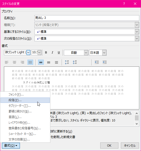 - [スタイルの変更]ダイアログボックスの[書式]ボタンをクリックして、一覧から[段落]を選択します。