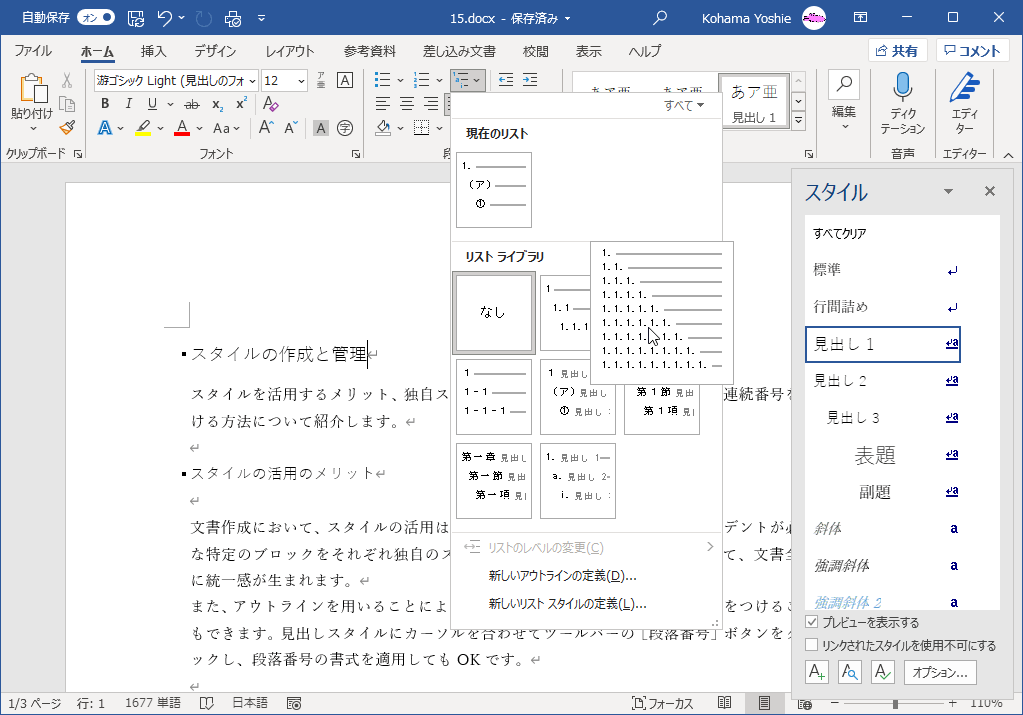 - 見出し2以降も同様に操作を繰り返します。見出し2以降は[現在のリスト]や[作業中の文書にあるリスト]から選択してもOKです。