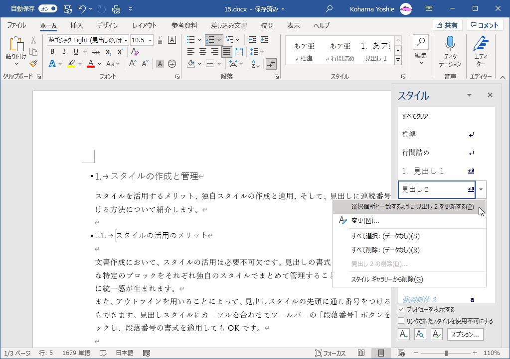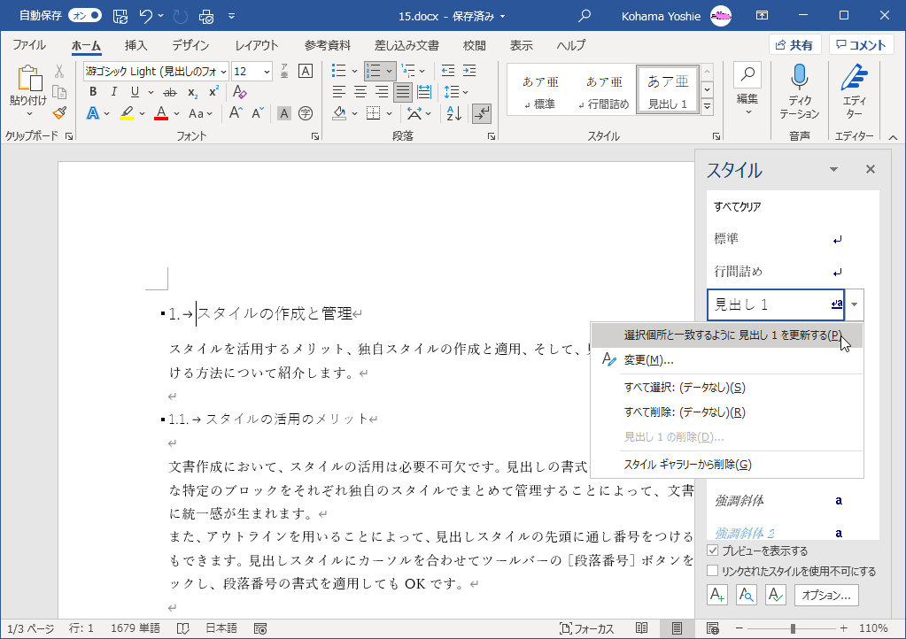- クイックスタイルギャラリーもしくは[スタイル]ウィンドウから[見出し1]を右クリックして、ショートカットメニューより[選択個所と一致するように見出し1を更新する]を選択します。ここでは、スタイルウィンドウの一覧から操作します。