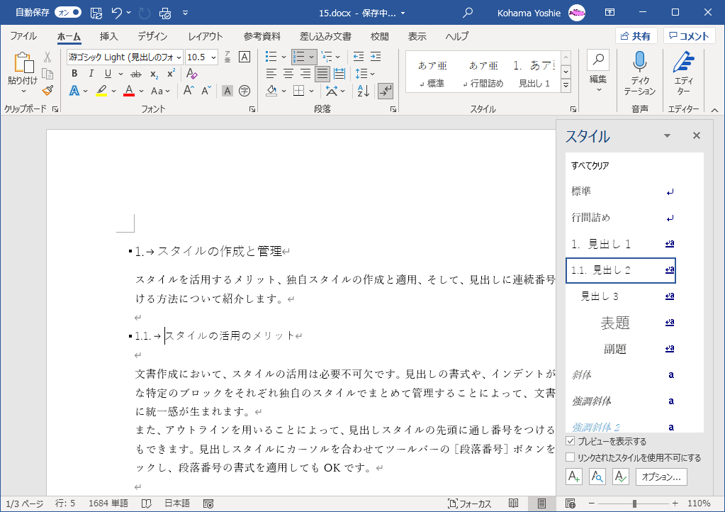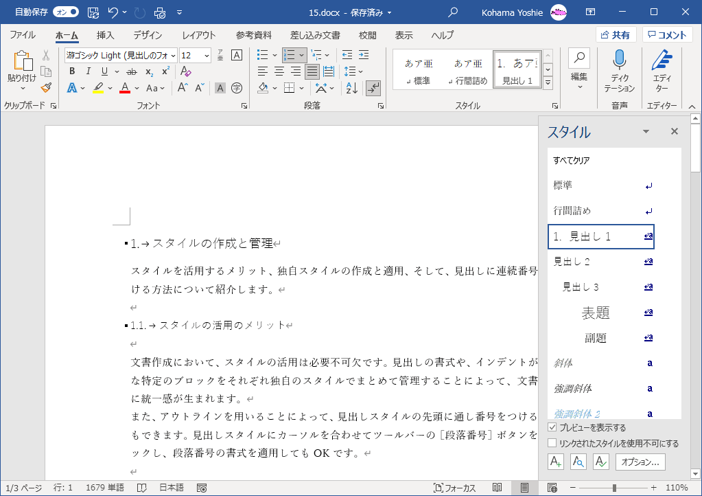 - 見出し1スタイルがアウトラインスタイルに更新されました。